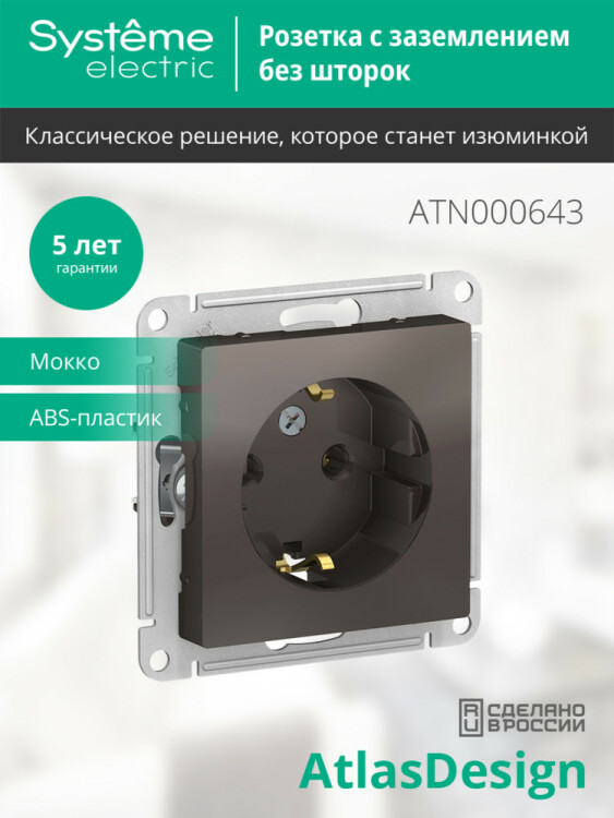 Механизм Systeme Electric (ранее Schneider Electric) серии AtlasDesign в цвете мокко розетки одинарной с заземлением и без шторок подходит для сетей 250 В, на ток 16 А.