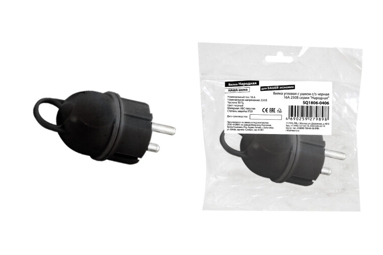 НАРОДНАЯ Вилка с/з угловая с ушком 16А 250В черная TDM (50/600шт)