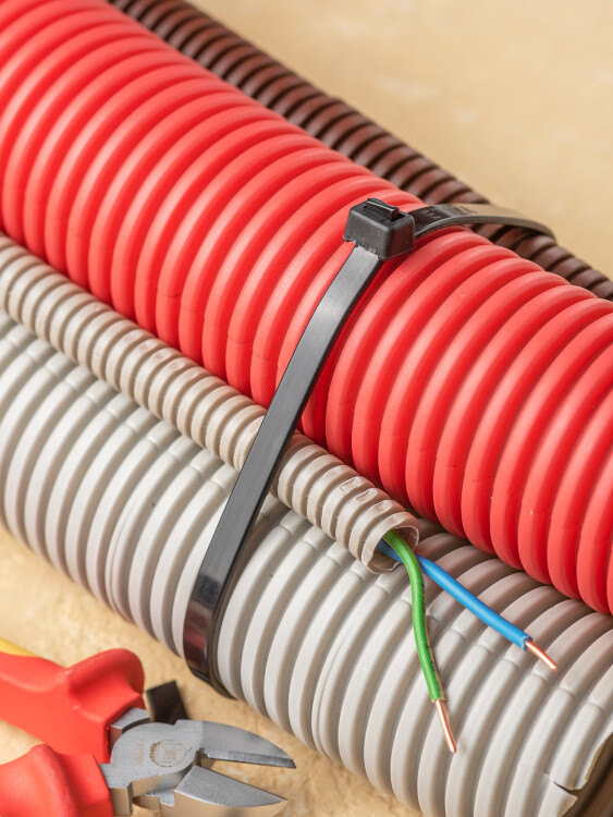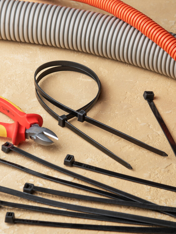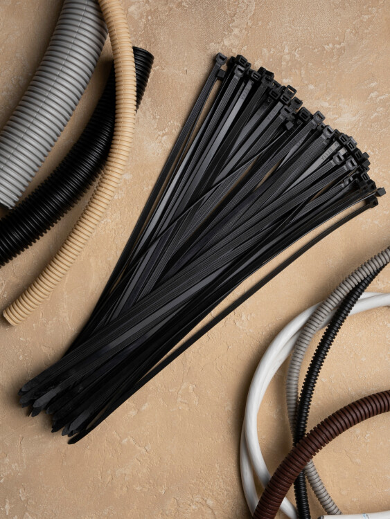 Предназначен для увязки кабелей и проводов в пучок и монтажа кабельных линий и проводников. Ремешок самофиксирующийся, блокирующий механизм. Изготовлен из Nylon 6.6, устойчивого к старению, коррозии, воздействию солей, ультрафиолета, кислот, щелочей, спирта, бензина и масел. При производстве кабельных стяжек черного цвета добавляется угольный порошок, который является одним из наиболее эффективных стабилизаторов. Он улучшает физические свойства продукции в стойкости к погодным условиям и УФ-излучению (прямые солнечные лучи).