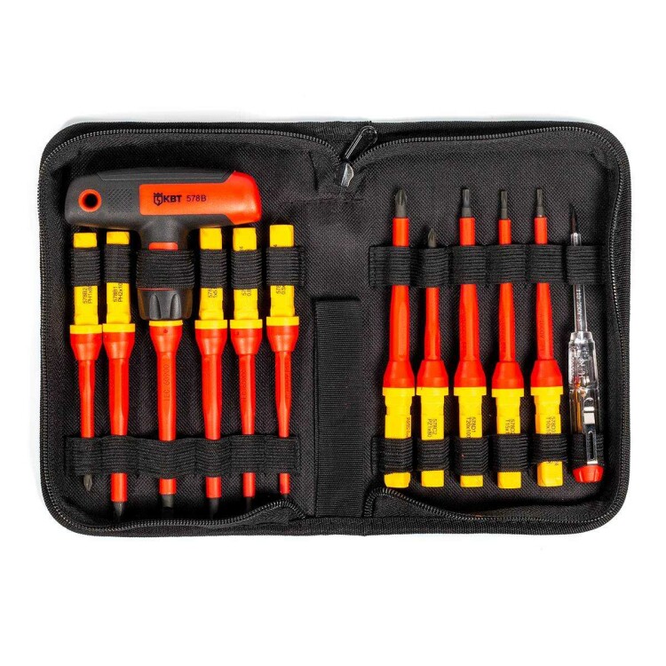 Состав набора:диэлектрическая бита: шлиц 3.0х100.диэлектрическая бита: шлиц 4.0х100.диэлектрическая бита: шлиц 5.5х100.диэлектрическая бита: шлиц 6.5х100.диэлектрическая бита: PH1х80.диэлектрическая бита: PH2х100.диэлектрическая бита: PZ1х80.диэлектрическая бита: PZ2х100.диэлектрическая бита: Т10х100.диэлектрическая бита: Т15х100.диэлектрическая бита: Т20х100.тестер напряжения 110250 В..Т-образная диэлектрическая рукоятка для сменных бит.Для работы под напряжением до 1000 В.Материал стержня бит: хром-ванадиевая сталь.Вороненые намагниченные наконечники.Материал изоляции бит: полипропилен.На каждой бите маркировка типоразмера.Двухкомпонентная Т-образная рукоятка с мягкими вставками из термопластрезины.Патентованный пружинный механизм фиксации биты в рукоятке.Упаковка: прочная сумка на молнии.Вес набора: 840 г.Габариты сумки: 220х135х50 мм.