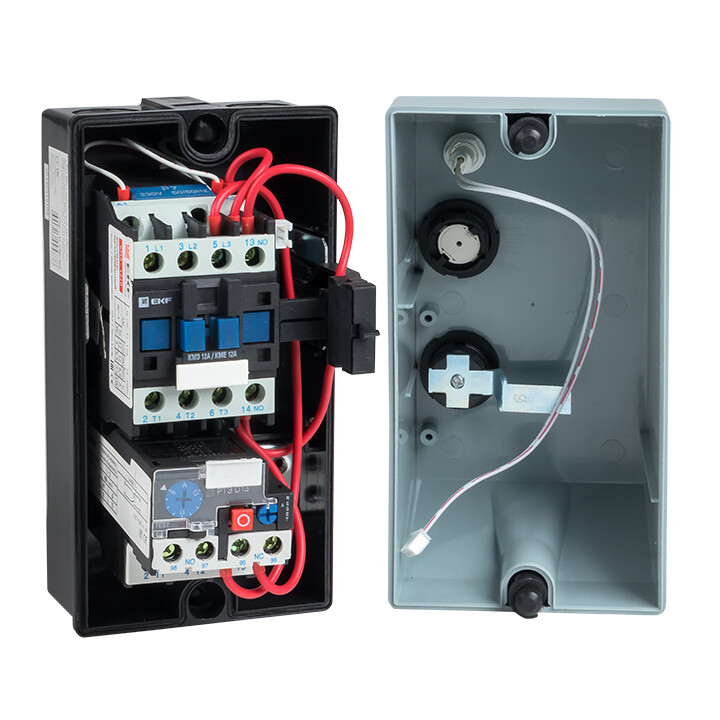Пускатель магнитный КМЭ EKF PROxima является комплектным устройством, состоящим из малогабаритного контактора КМЭ, теплового реле РТЭ, оболочки с сальниками и кнопок управления. Пускатели предназначены для дистанционного пуска непосредственным подключением к сети и остановки трехфазных асинхронных электродвигателей с короткозамкнутым ротором на напряжение переменного тока до 400 В, а также для защиты электродвигателей от перегрузок недопустимой продолжительности и сверхтоков, возникающих при обрыве одной из фаз. При применении контакторов КМЭ 0910 – КМЭ 3210 используется пластиковый корпус, контакторов КМЭ 4011 – КМЭ 9511 – металлическая оболочка.