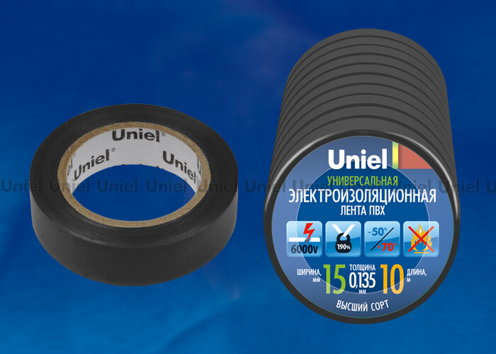 UNIEL Изолента ПВХ 15мм*10м черная 10шт/уп (UIT-135P 10/15/10 BLK)