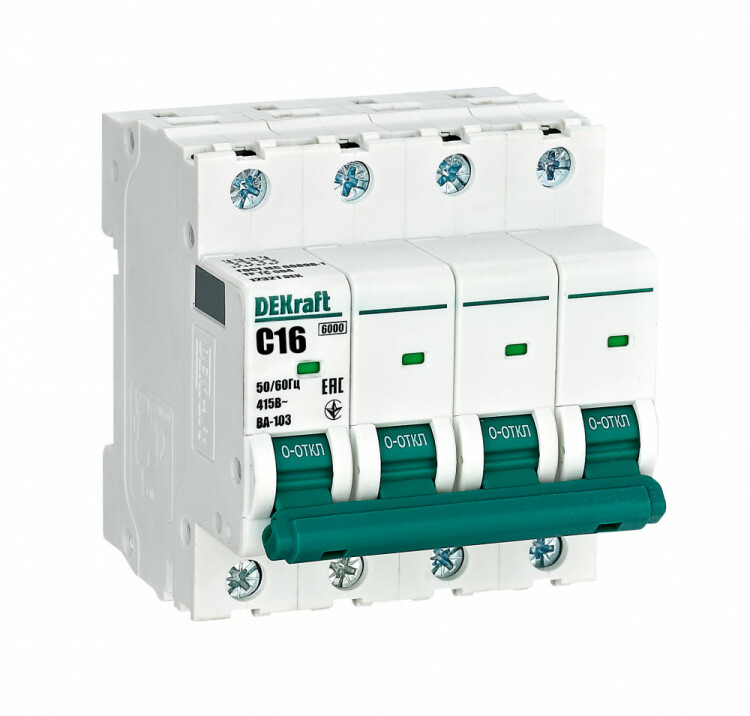 Автоматический выключатель серии ВА-103 NEW DEKraft; 4P; номинальный ток 16 А; характеристика C; отключающая способность 6 кА, что позволяет использовать аппараты в качестве вводных. 5 монолитных заклепок повышают прочность корпуса аппарата. Окошко-индикатор всегда показывает состояние контактов вне зависимости от положения рукоятки управления. Боковые каналы охлаждения повышают стабильность работы при высоких температурах окружающей среды. Есть возможность установки дополнительных аксессуаров с левой стороны устройства. Аппарат на 100% совместим с корпусами и оболочками DEKraft, Systeme Electric.