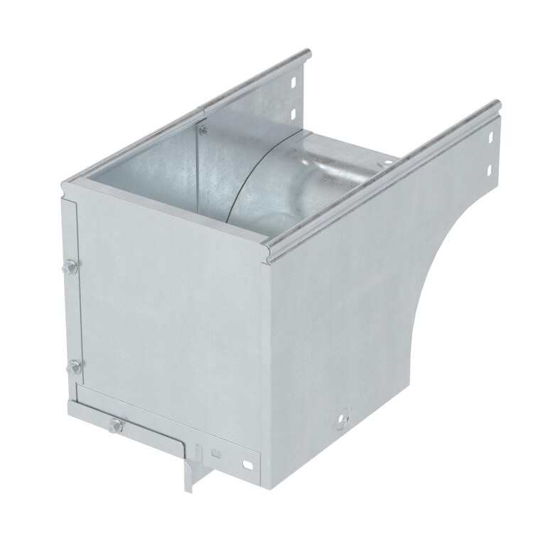 Угол применяется с лотками шириной 150 мм и высотой 80 мм. Внутренний радиус аксессуара - 100 мм. Исполнение – "сталь, оцинкованная по методу Сендзимира". Применение комплектных аксессуаров облегчает расчет числа необходимых элементов для монтажа – в комплект уже входят соединительные пластины и детали крепежа.
