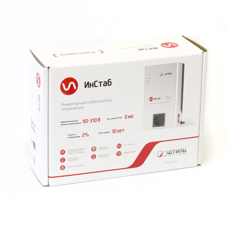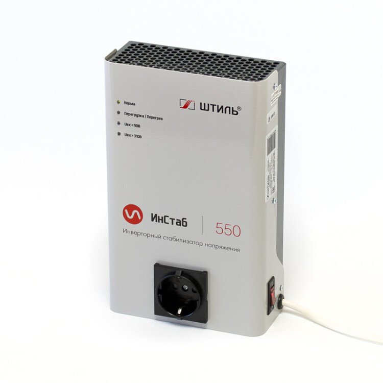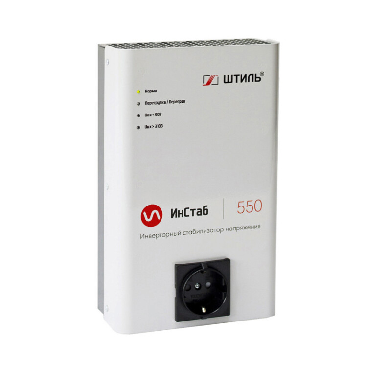 Инверторный стабилизатор напряжения Штиль IS550 устройство нового поколения, принцип работы которого основан на технологии двойного, бестрансформаторного преобразования энергии. Он предназначен для защиты от повышенного и пониженного входного напряжения однофазных электроприборов с потребляемой мощностью не более 550 ВА/ 400 Вт, например, газовых котлов, телевизоров, ПК и периферийного оборудования, аудио- и видеотехники. Стабилизатор выполнен в конструктиве для настенной установки. Он подключается к сети с помощью кабеля длиной 1,3 м с трёхполюсной вилкой. Для подключения нагрузки на передней панели предусмотрена EURO розетка с заземлением. Здесь же расположены четыре светодиодных индикатора, которые позволяют контролировать состояние и режим работы стабилизатора. В стабилизаторе реализован конвекционный безвентиляторный способ охлаждения, за счёт чего он работает практически бесшумно. Предусмотрена электронная аварийная защита от короткого замыкания, импульсных помех, перегрузки, перегрева и аварии сети.