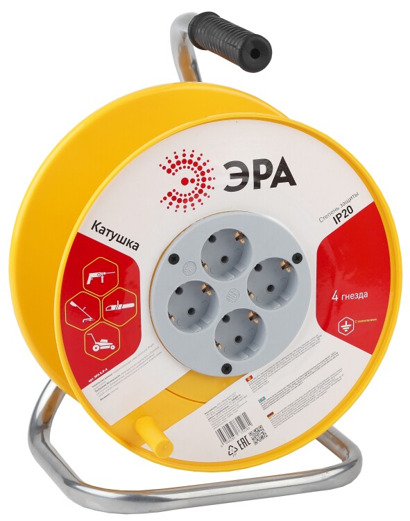 Переносная катушка на 4 гнезда. Розетки с заземлением. Отличное решение для строительных, ремонтных, дачных работ. Позволяет организовать одновременное подключение до 4 электроприборов с максимальной нагрузкой 16 A / 3500 Вт. Благодаря этой удобной катушке работать с электроприборами можно на значительном расстоянии от сети. Провод в комплект не входит. Катушка выполнена из прочного пластика, имеет устойчивую металлическую подставку и эргономичную ручку для переноса.