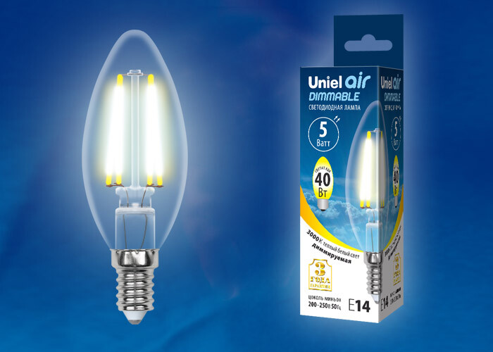 LED-C35-5W/WW/E14/CL/DIM GLA01TR Лампа светодиодная диммируемая. Форма "свеча", прозрачная. Серия Air. Теплый белый свет (3000K). Картон. ТМ Uniel