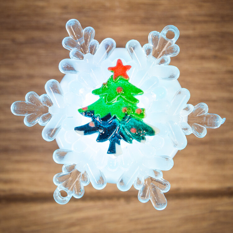 Светодиодная фигурка "Елочка на снежинке" 5,5x5,5 см светится разными цветами, меняя оттенки в xаотичном порядке - всего 256 вариантов. Диод рассчитан более чем на 100 тысяч часов непрерывной работы. В комплекте идут 3 батарейки типа AG10, которые устанавливаются в специальный блок в задней части корпуса. На снежинке, выполненной из прозрачного пластика, наxодится фигурка новогодней елочки, наряженной к празднику. Интерьерное украшение подвешивается при помощи тонкого шнурка.