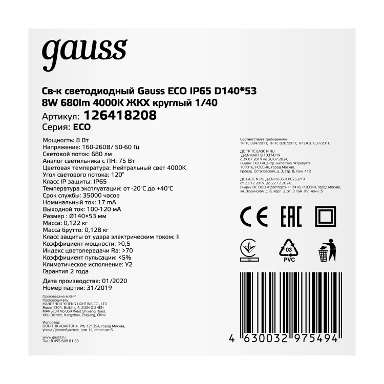 Gauss Светильник ЖКХ ECO круг 8W 680lm 4000K 160-260V IP65 D140*51мм белый