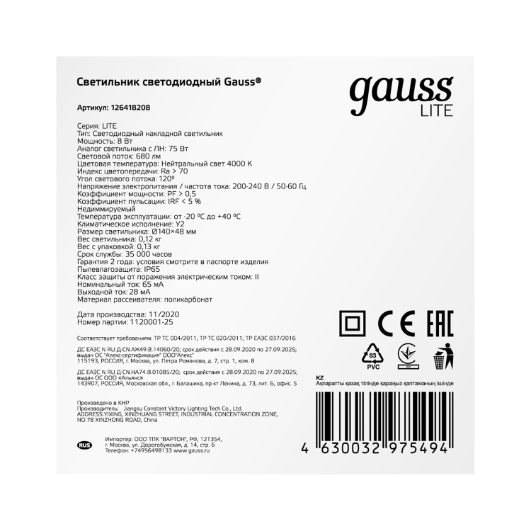 Светильники Gauss Lite предназначены для общего освещения наземных/подземных проходов, проездов, подъездов, лестничных клеток, входных групп, балконов, технических и подсобных помещений, в том числе с повышенными требованиями к пылевлагозащите до IP65.