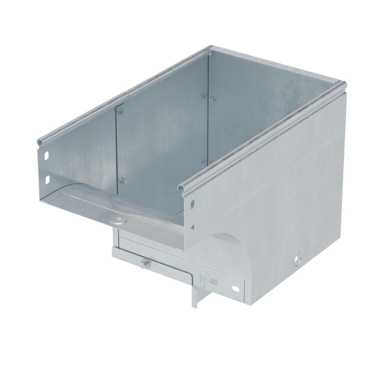 Угол применяется с лотками шириной 100 мм и высотой 100 мм. Внутренний радиус аксессуара - 100 мм. Исполнение – "сталь, оцинкованная по методу Сендзимира". Применение комплектных аксессуаров облегчает расчет числа необходимых элементов для монтажа – в комплект уже входят соединительные пластины и детали крепежа.
