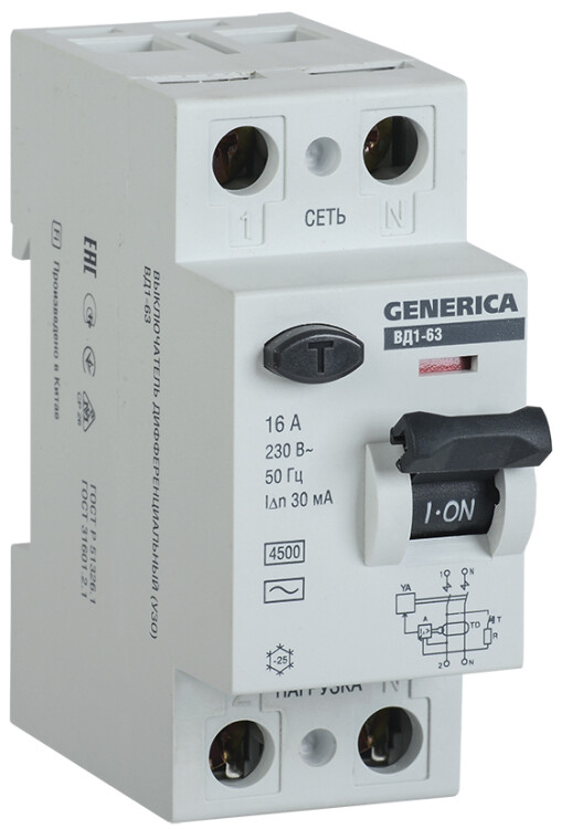 Быстродействующий защитный выключатель ВД1-63 (УЗО) GENERICA - устройство электронного типа, зависящее от напряжения и реагирующее на дифференциальный ток, без встроенной защиты от сверхтоков. Предназначен для защиты человека от поражения электрическим током.