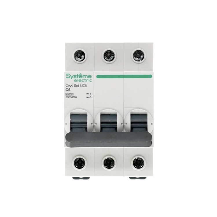 Автоматический выключатель серии City9 Set Systeme Electric, 3-полюсный, номинальный ток 6 А, характеристика С, Icn = 4.5 кА. Примен яется в электрических сетях напряжением 400 В. Предназначен для защиты от перегрузок и токов короткого замыкания. Оснащен механизмом «мгновенной коммутации». Ударопрочный корпус из специального пластика с 6 металлическими заклепками. Безопасные клеммы исключают попадание кабелей в заклеммное пространство.