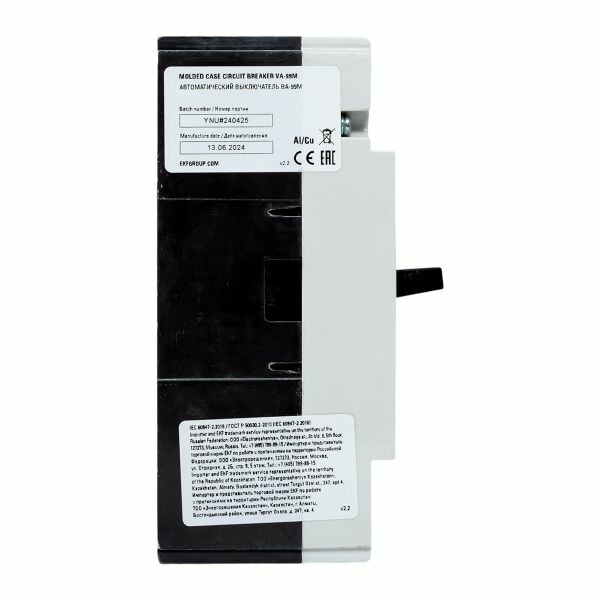 Выключатель ВА-99М выполнен в виде моноблока и состоит из основания и крышки с фальшпанелью, в которой имеется окно для рукоятки управления и толкатель кнопки «Тест» - проверки механизма отключения выключателя. Основание выполнено из термостойкой пластмассы, не поддерживающей горение и являющейся несущей конструкцией для присоединительных зажимов, неподвижных и подвижных контактов с системой дугогашения, механизма управления, блока защиты от сверхтоков. Крышка закрывает все подвижные элементы механизма управления и внутренние токоведущие части.
