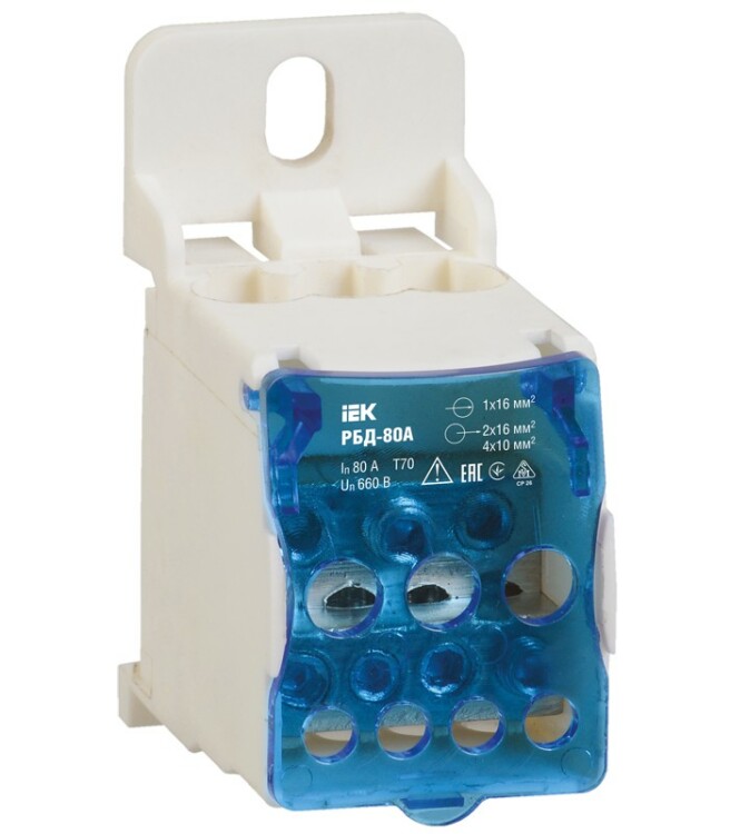 Распределительные блоки РБД предназначены для использования в качестве клеммного зажима при подключении к проводнику большего сечения нескольких проводников меньшего сечения, для создания упорядоченных систем распределения в шкафах, для организации главной заземляющей шины. Предназначены для монтажа на DIN-рейку или на монтажную панель как в силовых шкафах, так и в квартирных распределительных щитах, для работы в сетях с напряжением до 1000 В частоты 50 Гц при температуре окружающего воздуха от –40 до +70 С. Распределительные блоки РБД изготовлены из высококачественной латуни с нанесенным специальным защитным покрытием. Корпус выполнен из негорючего пластика. Способы установки: – на монтажную DIN-рейку 35 мм, – на панель щита двумя винтами.
