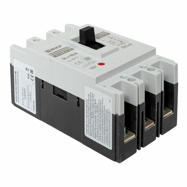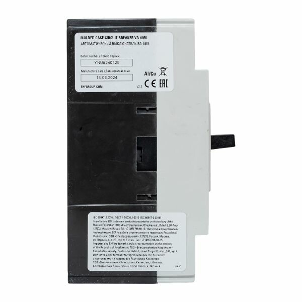 Выключатель ВА-99М выполнен в виде моноблока и состоит из основания и крышки с фальшпанелью, в которой имеется окно для рукоятки управления и толкатель кнопки «Тест» - проверки механизма отключения выключателя. Основание выполнено из термостойкой пластмассы, не поддерживающей горение и являющейся несущей конструкцией для присоединительных зажимов, неподвижных и подвижных контактов с системой дугогашения, механизма управления, блока защиты от сверхтоков. Крышка закрывает все подвижные элементы механизма управления и внутренние токоведущие части.