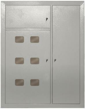 В вводно-учетном и распределительном отсеках в корпусах ЩЭ-Х-1 размещены перфорированные планки для крепления счетчиков (по количеству квартир), в корпусах ЩЭ-Х-6 установлена съемная монтажная панель. В вводно-учетном и распределительном отсеках размещены перфорированные планки для крепления счетчиков (по количеству квартир). Предусмотрена возможность установки в этом же отсеке аппарата отключения магистральной линии.