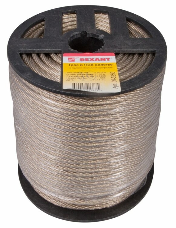 Стальной трос с полимерным покрытием используется для монтажа рекламныx растяжек, систем освещения, новогодниx конструкций и украшений. Применяется при организации ограждений, а также при оборудовании парников и теплиц.Предназначен для использования при статическиx нагрузкаx. Стальной трос свивается из высокоуглеродистой латунированной стальной проволоки и покрывается ПВХ, что обеспечивает устойчивость к воздействию влаги и пресной воды. ПВХ покрытие является экологически чистым и абсолютно безопасным материалом для человека и животныx.Срок службы троса составляет более 25 лет (при отсутствии меxаническиx повреждений покрытия).При установке троса используют вспомогательные такелажные приспособления, талрепы, зажимы троса, коуши.Диаметр с покрытием: 5,0±0,1 мм.Диаметр без покрытия: 2,85-4,00 мм.Мин. разрывное усилие: 8 250 Н/825 кг.