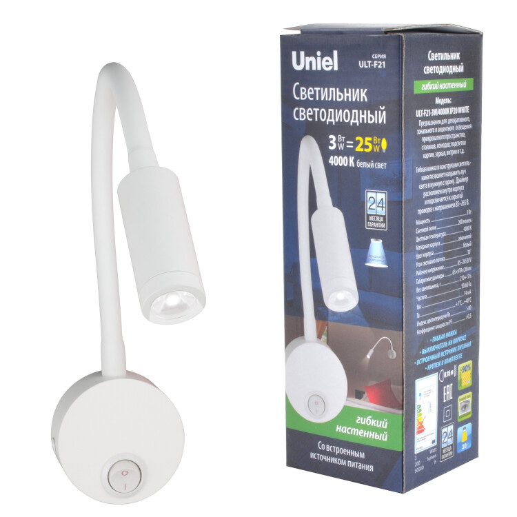 ULT-F21-3W/4000K IP20 WHITE Светильник светодиодный настенный гибкий для интерьерного освещения. 85-265В. Белый свет (4000К). Белый. TM Uniel