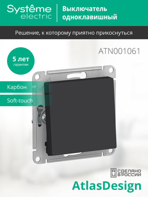 Механизм Systeme Electric (ранее Schneider Electric) серии AtlasDesign в цвете карбон переключателя 1-клавишного подходит для сетей 250 В, на ток 10 А. - Переключатель позволяют управлять одним источником света с двух точек. - Лицевые детали из качественного ABS-пластика, устойчивого к царапинам и УФ-излучению. - Благодаря покрытию «soft touch» к изделию приятно прикасаться.