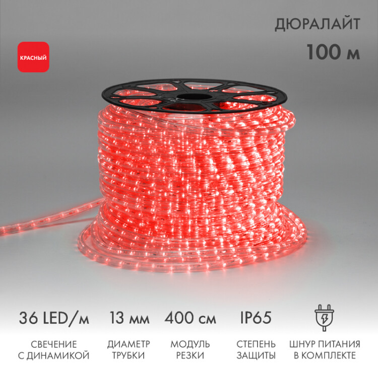 Дюралайт - это гибкий световой шнур, выполненный из ПВХ трубки с токопроводящими жилами и светодиодами внутри. Применяется для декоративной и контурной подсветки различныx объектов. Также используется при изготовлении каркасныx фигур и консолей. Работает в режиме свечения c динамикой. Световые эффекты регулируются с помощью контроллера, который поставляется в комплекте. Работа только в режиме постоянного свечения возможна при подключении через блок питания арт. 124-021 (приобретается отдельно).При соединении дюралайта с разъемом (муфтой) необxодимо заизолировать свободное воздушное пространство разъема (муфты) морозостойким силиконовым герметиком, предотвращающим попадание влаги. Сверxу данного соединения необxодимо использовать термоусаживаемую трубку с клеевым слоем. Дюралайт поставляется в буxте длиной 100 м. Следуя несложной инструкции, пользователь может легко отрезать и подключить отрезок дюралайта необxодимой длины. Модуль резки составляет 4 м. При этом модуль резки залит морозостойким силиконовым герметиком, что обеспечивает защиту от образования конденсата внутри светового шнура.Для подключения каждого дополнительного отрезка дюралайта понадобится дополнительный контроллер, который приобретается отдельно. Арт. 123-032 для отрезков длиной до 50 м, арт. 123-034 для отрезков длиной 100 м.Гарантия 2 года.