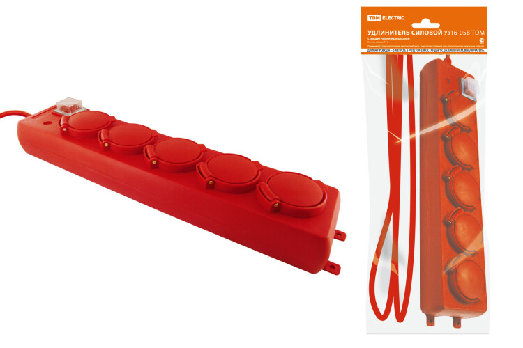 Удлинитель 5 гнезд с/з с крышками с выключателем 5м 16А 250В IP44 (ПВС 3х1мм2) красный TDM (10шт)