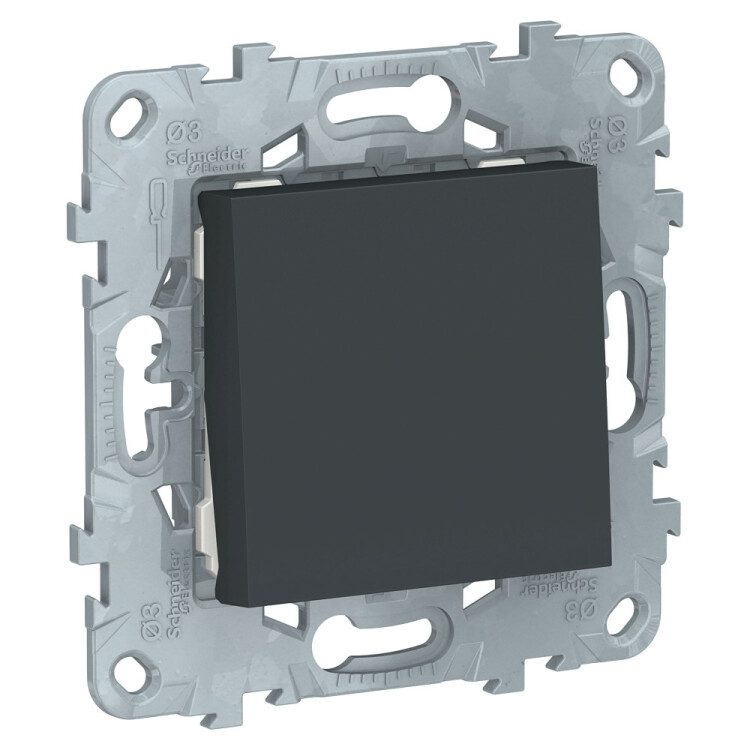 Переключатель одноклавишный Schneider Electric UNICA NEW (антрацит) без подсветки предназначен для сетей до 250 В на ток до 10 А. - 1 переключающий контакт. - Специальные направляющие для облегчения ввода кабеля. - Переключатель позволяет управлять одним источником света из двух точек.