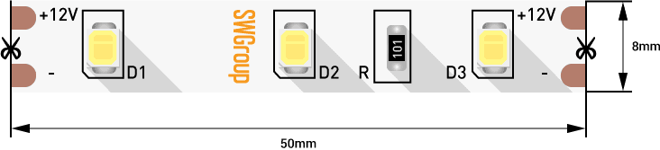 SWG 4,8 Вт/м SMD2835 (60 диодов на метр) Открытая (IP20) Цвет Холодный белый 12В выводится