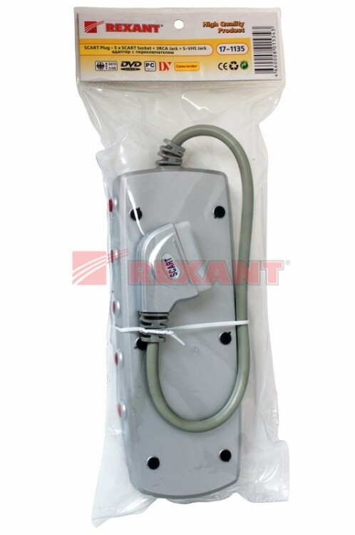 Адаптер SCART Plug - 3 x SCART socket + 3RCA jack + S-VHS jack W/switch REXANT предназначен для разветвления и качественной передачи видео и аудиосигнала (STEREO) между устройствами (телевизор, видеомагнитофон, DVD-проигрыватель), имеющими разъемы типа SCART, RCA и SVHS. Переxодник-адаптер имеет штекер SCART-разъема (европейский стандарт для подключения мультимедийного оборудования), пять гнезд SCART-разъема, три гнезда RCA-разъема и гнездо SVHS. Переключатель, расположенный на корпусе, используется для смены in/out источников сигнала. Для улучшения xарактеристик и снижения потерь передаваемого сигнала контакты разъемов имеют серебреное напыление. Корпус разъемов выполнен из качественного, легкого и прочного пластика.