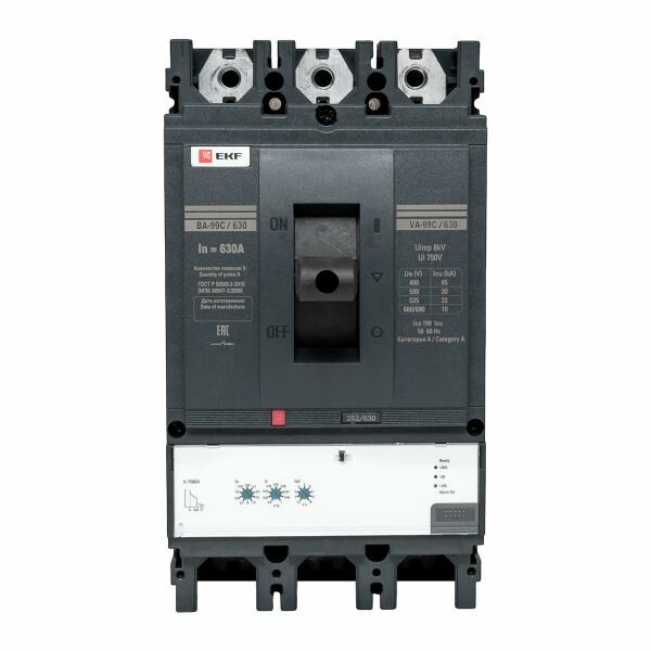 Выключатель ВА-99С выполнен в виде моноблока и состоит из основания и крышки с фальш-панелью, в которой имеется окно для рукоятки управления и толкатель кнопки «Тест» – для проверки механизма отключения выключателя.Основание выполнено из термостойкой пластмассы, не поддерживающей горение и являющейся несущей конструкцией для присоединительных зажимов, блок ротоактивных контактов с двумя дугогасительными камерами представляет собой жесткую сборку в отдельном корпусе, механизма управления, блока защиты от сверхтоков и перегрузки (расцепителя). Крышка закрывает все подвижные элементы механизма управления и внутренние токоведущие части.