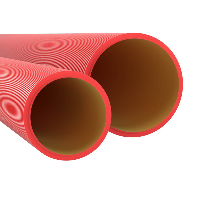 Двустенные жесткие трубы предназначены строго для скрытой прокладки: в грунте или в монолите строений. Трубы выдерживают значительные нагрузки, а потому могут использоваться даже в зонах с высокими нагрузками (например, на участках, предназначенных для проезда автотранспорта). Трубы надежно защищают кабель от любых внешних воздействий. Жесткая двустенная труба для кабельной канализации имеет диаметр 110 мм. Кольцевая жесткость (SN) 12 кПа. Поставляется отрезками по 5,70 метров. К каждому отрезку в комплекте идет соединительная муфта. Материал - ПНД. Цвет внешней стенки - красный.