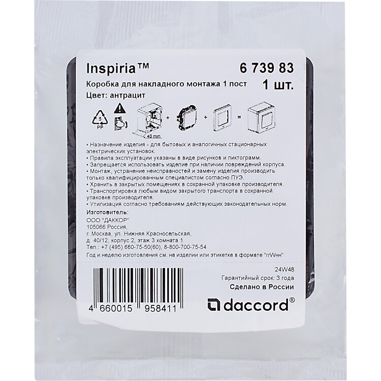 Коробка для накладного монтажа Legrand/Daccord Inspiria, 1 пост, цвет "Антрацит".