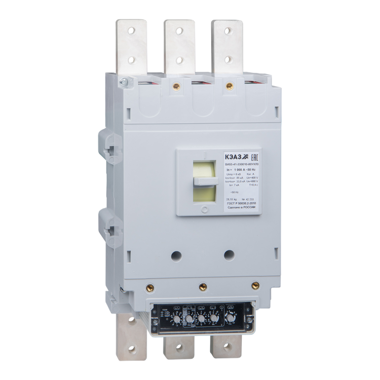 Блочный автоматический 3 полюсный выключате ль переменного тока с предельной коммутационной способностью при переменном токе 55 кА на номинальный ток 400 А .