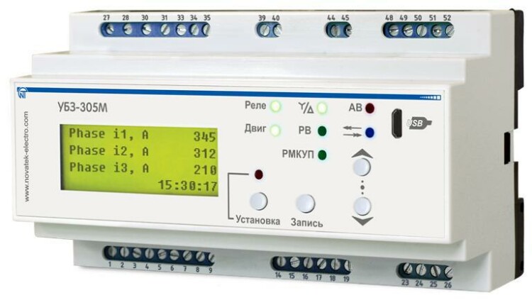 Новатек-Электро Ун иверсальный Блок Защиты Электродвигателя УБЗ-305М-45, 380В, Ном. ток двигателя до 315 кВт (внешние Т/Т - в комплект не входят) , счетчики мото-часов, электроэнергии, ж/к экран, исполнениеP, DIN-рейка, Modbus выход Micro USB . Диаметр диф. трансформатора (d=45мм) в комплекте