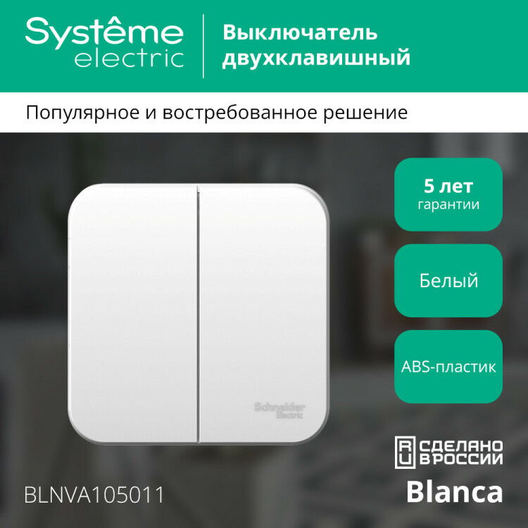 Выключатель Systeme Electric (ранее Schneider Electric) BLANCA (белый, открытой установки) с изолирующей пластиной двухклавишный предназначен для сетей до 250В, на ток до 10А. Двухклавишный выключатель позволяет управлять двумя источниками света из одной точки. Он изготовлен из ABS-пластика, прост в установке и удобен в применении.
