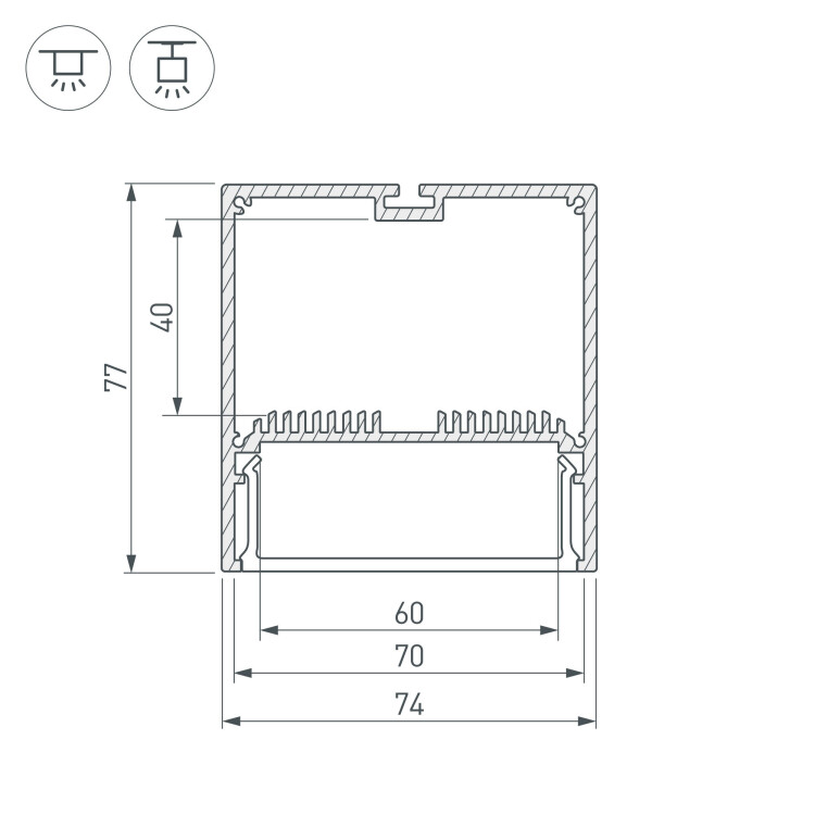 Комплект с экраном. Алюминиевый профиль для светодиодных лент и линеек. Цвет - черный RAL9005 (порошковая окраска). Габаритные размеры (L×W×H): 2500x74x77 мм. Ширина площадки для ленты 60 мм. Отсек для БП 70х40мм. Аксессуары приобретаются отдельно.