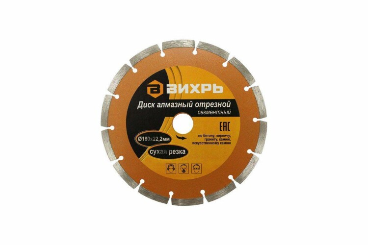 Диск алмазный отрезной сегментный 180х22,2 мм, сухая, 73/10/3/4, Вихрь