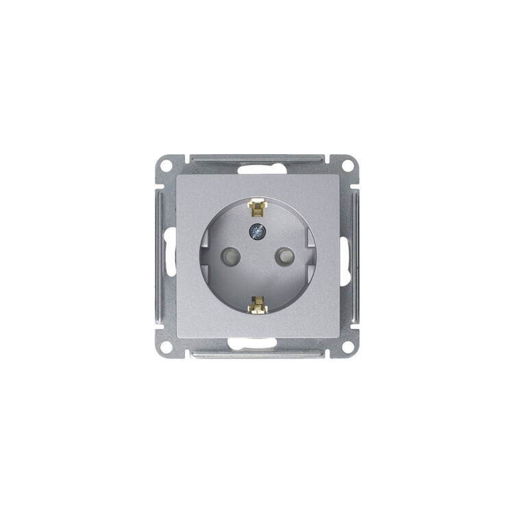 Механизм Systeme Electric (ранее Schneider Electric) серии AtlasDesign в цвете алюминий розетки одинарной с заземлением и ш торками подходит для сетей 250 В, на ток 16 А.