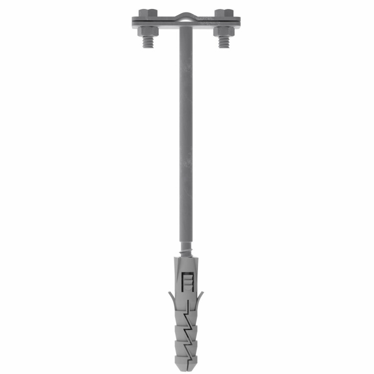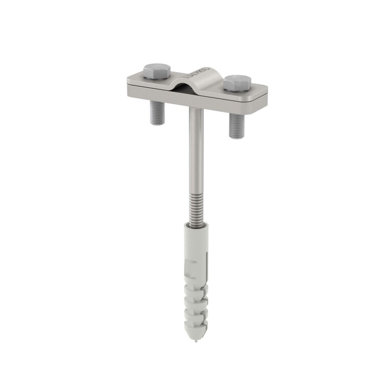 Фасадный держатель применяется для крепления круглых (8-10 мм) и плоских (25 мм) токоотводов по фасаду здания. Способ крепления проводника - болтовой зажим. Длина - 165 мм, материал - горячеоцинкованная сталь.