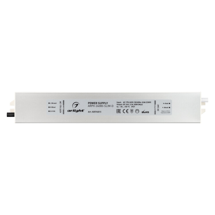 Источник напряжения с гальванической развязкой для светодиодных изделий. Входное напряжение 170-265 VAC. Выходные параметры: 24 В, 3,3 А, 80 Вт. Встроенный PFC >0,5. Герметичный алюминиевый корпус IP 67. Рабочая температура -30…+50C°. Габаритные размеры длина 258 мм, ширина 40 мм, высота 22 мм. Гарантийный срок 3 года.