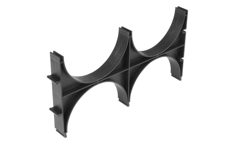 Предназначен для крепления и упорядочивания гибких, жёстких, дренажных и ливневых двустенных гофрированных труб одного диаметра при блочном монтаже.