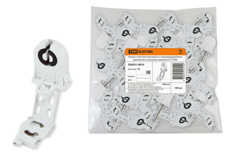 Применение:Предназначены для надежной фиксации и контакта люминесцентных ламп Т5, Т8Клипсы используются для крепления люминесцентных ламп Т8, Т5 на винт М4 Материалы:Корпус патронов изготовлен из поликарбонатаМатериал контактной группы патронов латуньМатериал клипс оцинкованная стальПреимущества:Патроны обладают высокими электроизоляционными свойствами, механической устойчивостью, стойкостью к УФ-излучениюКлипсы устойчивы к коррозии и температурным перепадамПатроны и клипсы расфасованы по 100 шт. в пакеты с фирменным стикером TDM ELECTRIC 0: Применение:Предназначены для надежной фиксации и контакта люминесцентных ламп Т5, Т8Клипсы используются для крепления люминесцентных ламп Т8, Т5 на винт М4