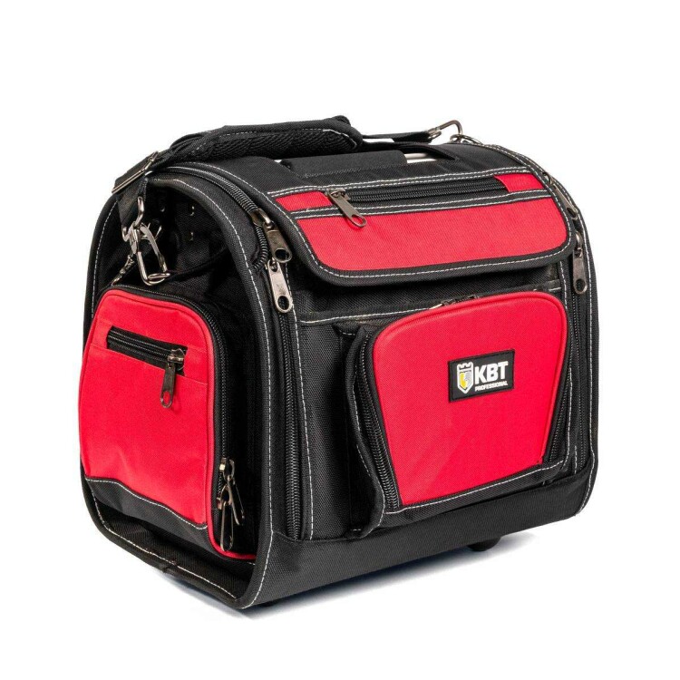 Передняя откидная крышка с внешним накладным карманом,13 небольших крепежных элементов из резиновой ленты для сменных бит и 6 небольших эластичных отделений из резиновой ленты; на внутренней части, 1 мини-карманом с внешней стороны крышки для узких предметов, а также тканевой лентой с металлическим карабином.