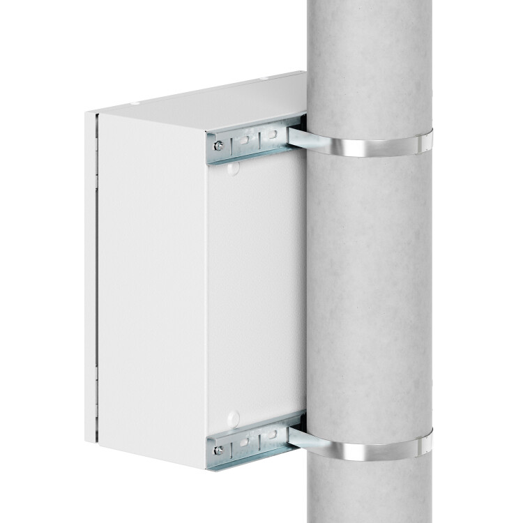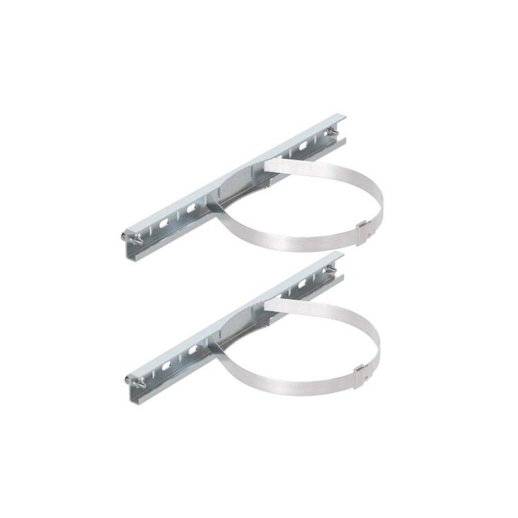 Комплект для крепления корпусов ST, STX, STE, STEX, STH, SDE, RAM box шириной 400 мм на опору. Крепежные профили изготавливаются из оцинкованной стали толщиной 2 мм, стяжные хомуты – из нержавеющей стали AISI 304. Максимальная статическая нагрузка на 2 профиля – 300 кг, подходят для круглых опор диаметром 40...195 мм или квадратных опор со стороной 60...165 мм. В комплект поставки входят: 2 профиля, 2 стяжных хомута, 2 замка для фиксации хомутов.