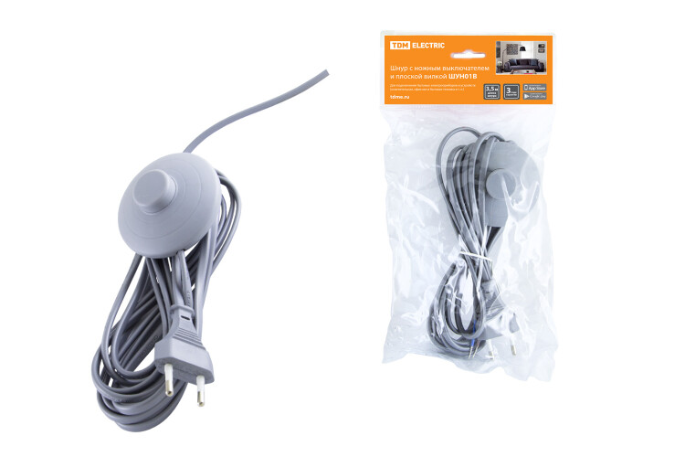 Шнур бра с ножным выключателем с плоской вилкой 3,5м (ШВВП 2х0,75мм2) серебряный ШУН01В TDM (1/80шт)