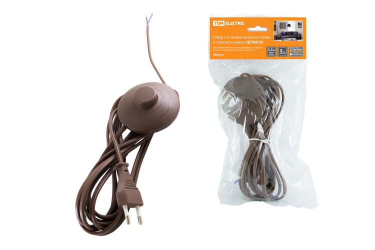 Шнур бра с ножным выключателем и плоской вилкой 3,5м (ШВВП 2х0,75мм2) коричневый ШУН01В TDM (1/80шт)