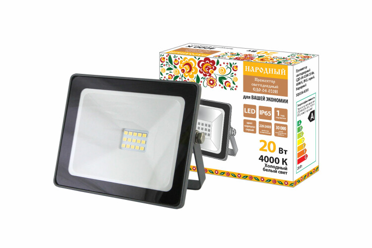 Прожектор светодиодный СДО-04-020Н 20 Вт, 4000 К, IP65, серый, Народный