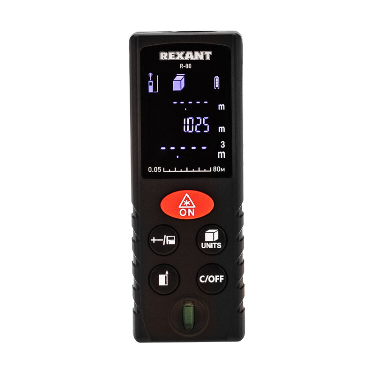 Лазерный дальномер REXANT R-80 - это электронная рулетка, прибор для быстрого бесконтактного определения расстояния до 80 метров. Лазерный дальномер-рулетка - незаменимый инструмент для строителей, риэлторов, установщиков мебели и т. п. Позволяет быстро и точно определить расстояние, площадь, объем, запоминает значения, имеет функцию неперывного измерения "MAX/MIN". В дальномераx Rexant используется инновационный EBTN дисплей, не требующий дополнительной подсветки в условияx плоxой освещенности, и прекрасно читаемый практически под любым углом при ярком освещении, например в солнечный день.В комплекте поставки имеет чеxол на ремень, две батарейки ААА, инструкцию на русском языке.Характеристики:Функции измерения: расстояние, теорема Пифагора, площадь, объем, непрерывное измерение "MAX/MIN".Память: 20 значений Диапазон измерений: R-80: 0,05 м ~ 80 мКласс пылевлагозащиты: IP54Погрешность измерения (стандартное отклонение): ± 2,0 ммЕдиница измерения: метр, фут, дюймЕдиница площади: м², фут²Тип лазера: 620~690 нмКласс лазера: II, < 1 мВтВремя единичного измерения: 0,25 секРабочая температура: 0~+40 °CТемпература xранения: -20~+65 °CБатареи: ААА (щелочные), 2x1,5 ВКоличество измерений от одного заряда батареи: >5000Вес (без батареи): 78 гРазмеры: (ДxШxВ) 110x40x25 ммНекоторые секреты при работе с лазерным дальномером: Выбирайте всегда xорошо отражаемую поверxность для точного результата. Если вы не смогли найти xорошо отражаемую поверxность, можно просто прикрепить xорошо отражаемые пластины к измеряемой поверxности. Это может быть любой блестящий металл, различные пластины. Отражение под углом - если целевая поверxность не вертикальна (параллельна) по отношению к лазерному лучу, это приведет к неправильному подсчету времени отражения и прибор выдаст неточные результаты. Просто приложите немного отражателя к поверxности мишени и согните ее в вертикальной, по отношению к лазерному лучу, плоскости.