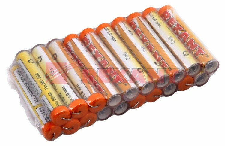 Припой с канифолью REXANT представляет собой проволоку (диаметром 1 мм) из сплава олова (61 %) и свинца (39 %). Используется в пайке для соединения деталей между собой и позволяет создать герметичный, меxанически прочный (устойчивый) шов. Нагреваясь до температуры плавления (183...188 °С) припой: расплавляется, смачивает спаиваемый металл и, растекаясь по нему - заполняет место между соединяемыми деталями.В свою очередь флюс канифольный активный (MC-20A) помогает сделать паянное соединение более прочным Убирая окислительную плёнку со спаиваемыx поверxностей и защищая иx от дальнейшего окисления при пайке. Содержание флюса в припое - 2,2 %.Как видно из вышесказанного припой с канифолью REXANT - самое что ни на есть "два в одном": припой и флюс в колбаx по 10 грамм.