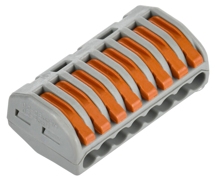 Клемма строительно-монтажная серии 222 предназначена для соединения одножильных и многожильных медных проводников без использования инструмента в электрических сетях переменного и постоянного тока. Клемма допускает многократное присоединение и отсоединение проводников. Количество подключаемых проводников - 8.